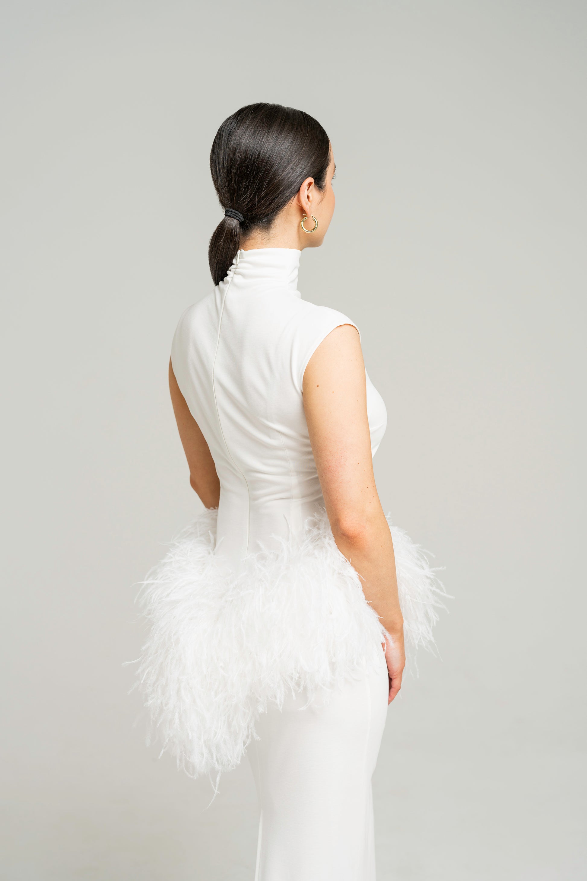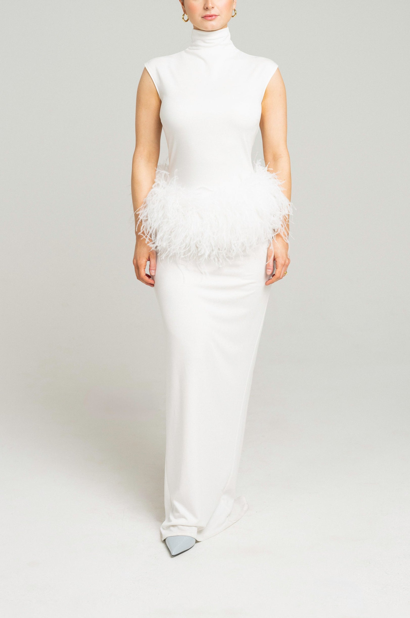The Ftero gown is a sculptural piece that marries minimalism with ethereal drama. Featuring a sleek, pillar-style silhouette, this gown exudes modern elegance. A detachable ostrich feather boa offers a striking contrast and a touch of opulence to an otherwise streamlined design.